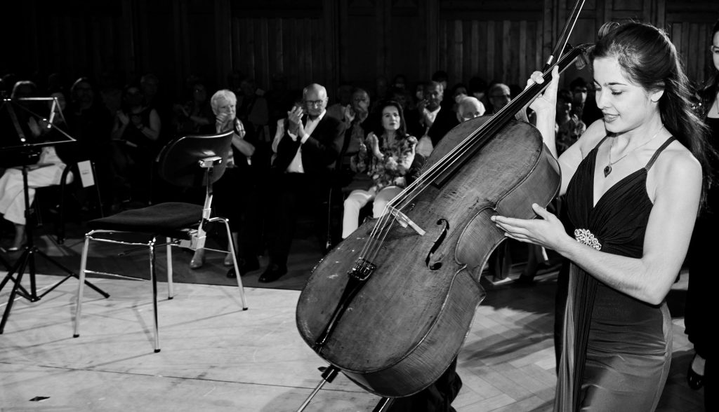 Another thing that changed is that, in the beginning, it was played also in processions: meaning that you can see on the back sometimes a little dot with an extra piece of wood. This meant that they probably had the cello around their necks to be able to walk and play at the same time. Later, it was developed for the cellists to have the ability to sit down and an end pin was also added, for example, the baroque cello — which has gut strings because back then the strings were made out of gut — didn’t have an end pin, and the baroque bow also changed its shape. Thus, during this time, it was mostly played in chambers or in smaller venues compared to the concert halls we have today (with thousands of people). Because to perform in bigger spaces, you need more tension from the instrument: so you need to change the physics of the instrument. For example, the bow — which was straight — is now is a little bit convex in order to create more tension on the bow hair (made of horses’ hair). So yeah, these are mostly the features, that I would say that have developed throughout the centuries. And since 250 years, we have only one type of cello from which the compositions are based on.